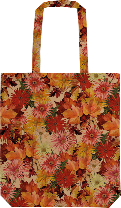 Bolsa de mano con estampado de hojas y flores otoñales naranjas, amarillas y rojas sobre fondo beige claro.