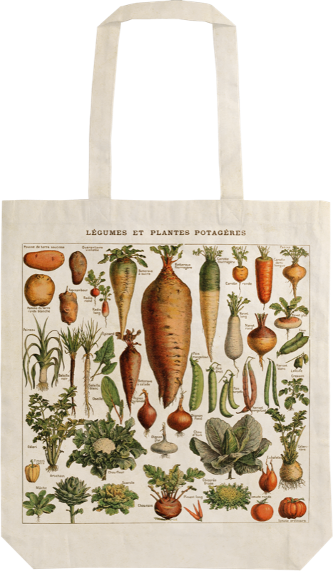 Bolsa de algodón con ilustraciones botánicas de época de diversas hortalizas y plantas de jardín.