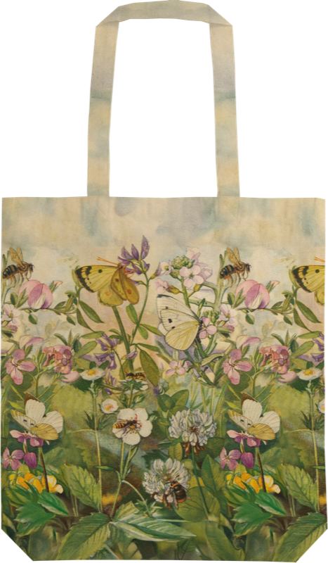 bolsa de mano con ilustraciones impresas de mariposas, abejas y flores en varios colores, con follaje verde y tonos celestes.