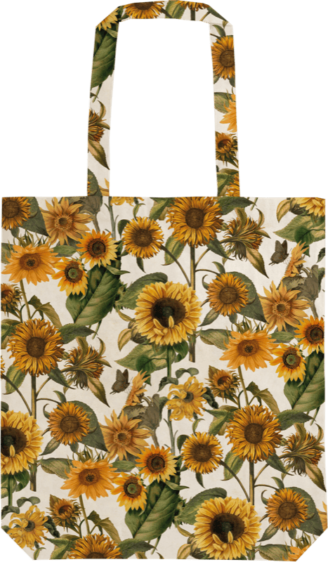 bolsa de tela con un vibrante estampado de girasoles amarillos y hojas verdes sobre fondo claro.