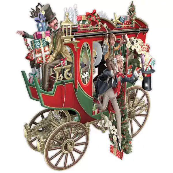 Un festivo carruaje rojo lleno de gente, regalos y adornos navideños, con los pasajeros alegremente colgados y alrededor del vehículo.