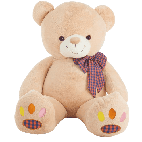 Oso de peluche marrón claro con una cara sonriente, un lazo de tela escocesa alrededor del cuello y unas coloridas almohadillas en las patas. 70cm