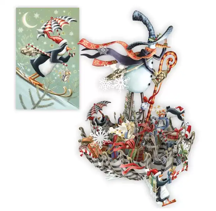 Ilustración estilizada de pingüinos esquiando y deslizándose en trineo con atuendo invernal, con un pingüino desplegable en 3D con bufanda y gorro que sostiene un bastón, rodeado de copos de nieve y regalos.