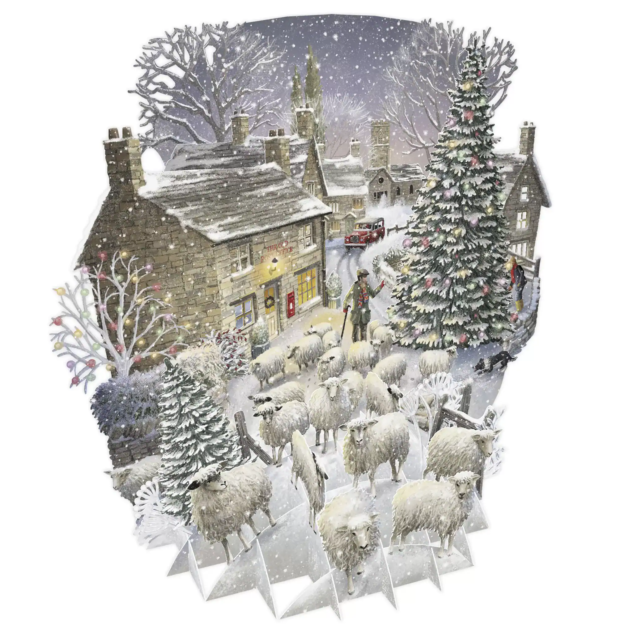 Escena de un pueblo nevado con ovejas pastando por la calle, un árbol de Navidad decorado, casitas, una persona y un vehículo rojo al fondo.