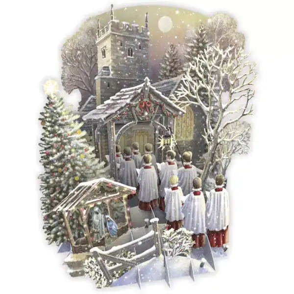 Un grupo de cantantes de coro vestidos con túnicas blancas entra de noche en una iglesia cubierta de nieve, con un árbol de Navidad decorado y un belén en primer plano.
